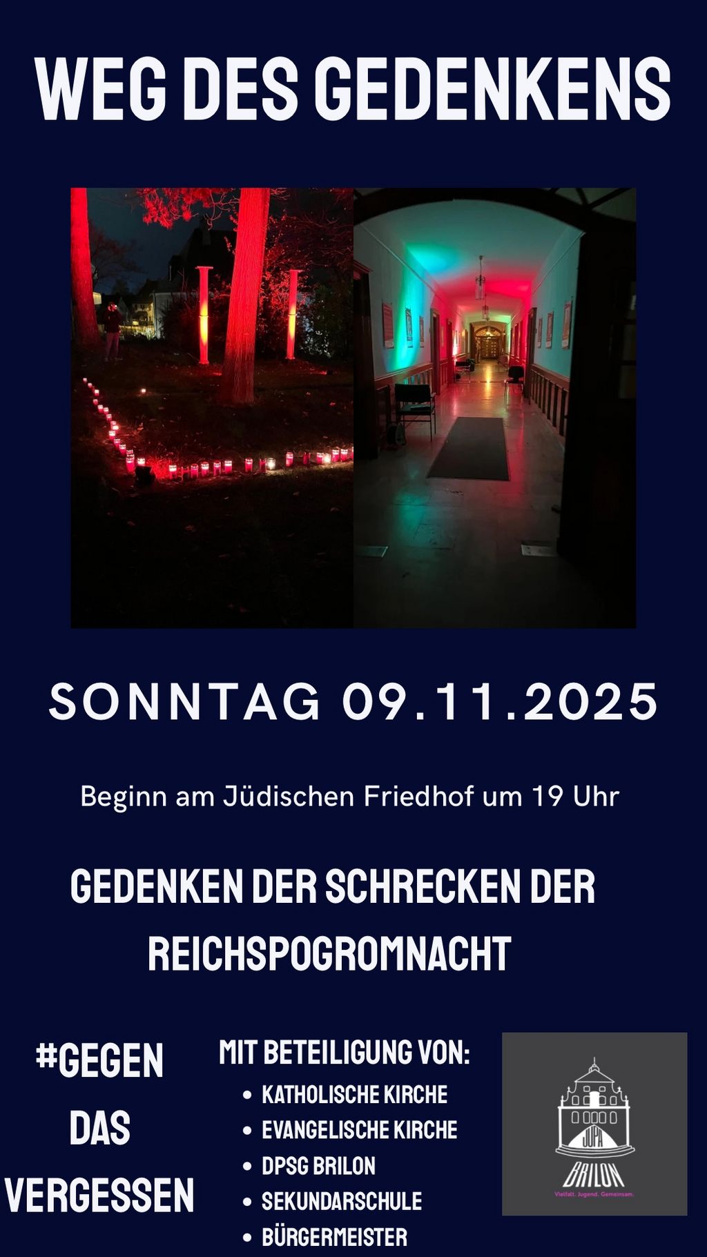 Die Evangelische Kirchengemeinde, die Propsteigemeinde St. Petrus und Andreas, die Stadt Brilon, das Jugendparlament Brilon und die Pfadfinder laden Sie, ihre Angehörigen, Freunde, Verwandte und Bekannte ein, diese Gedenkstunde gemeinsam mit uns zu verbringen.