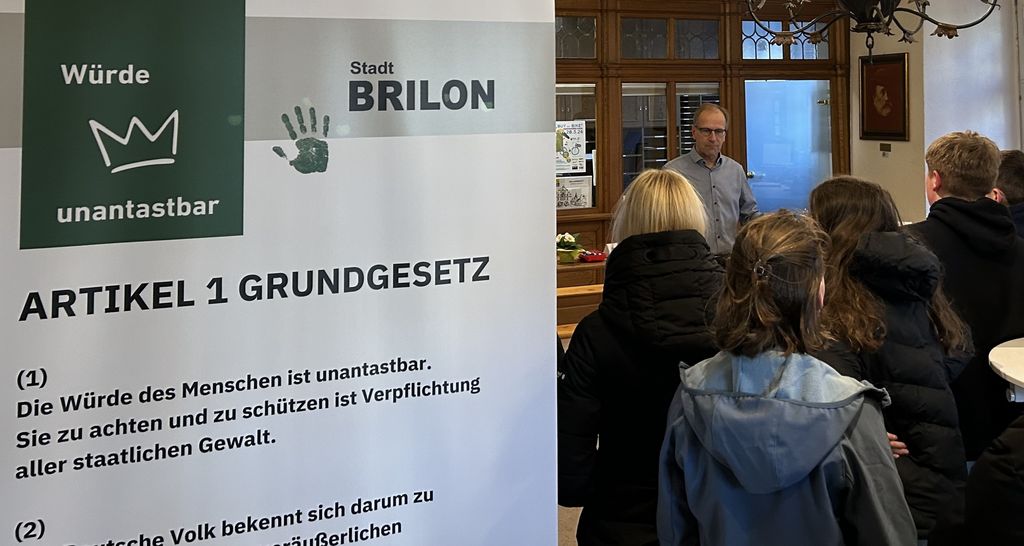 „Würde unantastbar – Ihre Meinung zählt!“ – unter diesem Motto hatte Bürgermeister Dr. Christof Bartsch am 18. März 2026 anlässlich des ersten Tages der Demokratiegeschichte in das Rathaus der Stadt Brilon eingeladen. Insgesamt rund 70 Gäste nutzten die Gelegenheit zu Gesprächen. Auch zwei Schulklassen des Gymnasiums Petrinum besuchten die Aktion und setzten sich mit den Fragen „Was bedeutet Menschenwürde im Alltag? Welche Beispiele für gelebte Menschenwürde sind besonders wichtig? Wie können Verletzungen der Menschenwürde verhindert werden?“ auseinander. In den Gesprächen mit dem Bürgermeister ging es um Mobbing unter Schülern, Respekt von Hautfarbe und Religion, Toleranz gegenüber anderen Meinungen und gegenseitige Rücksichtnahme. Auch der Iran-Krieg und die Diskussionen über die Regenbogenfahne, die in Brilon auf dem Marktplatz hängt und zu zahlreichen Kommentaren in den sozialen Medien geführt hatte, kamen zur Sprache. Alle Meinungen wurden auch zu Papier gebracht. Im Sommer werden die Ergebnisse in einer Ausstellung im Rathaus zu sehen sein.